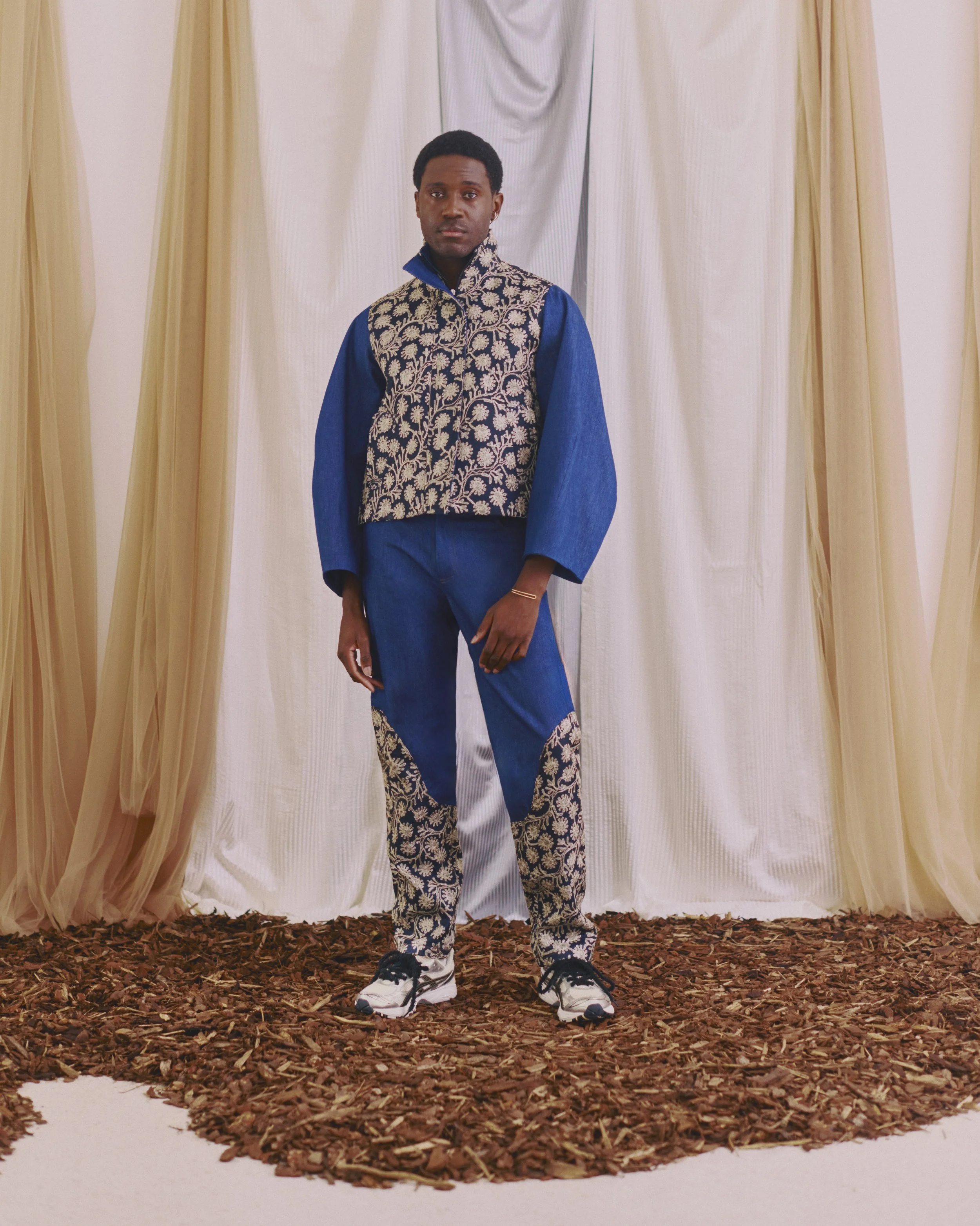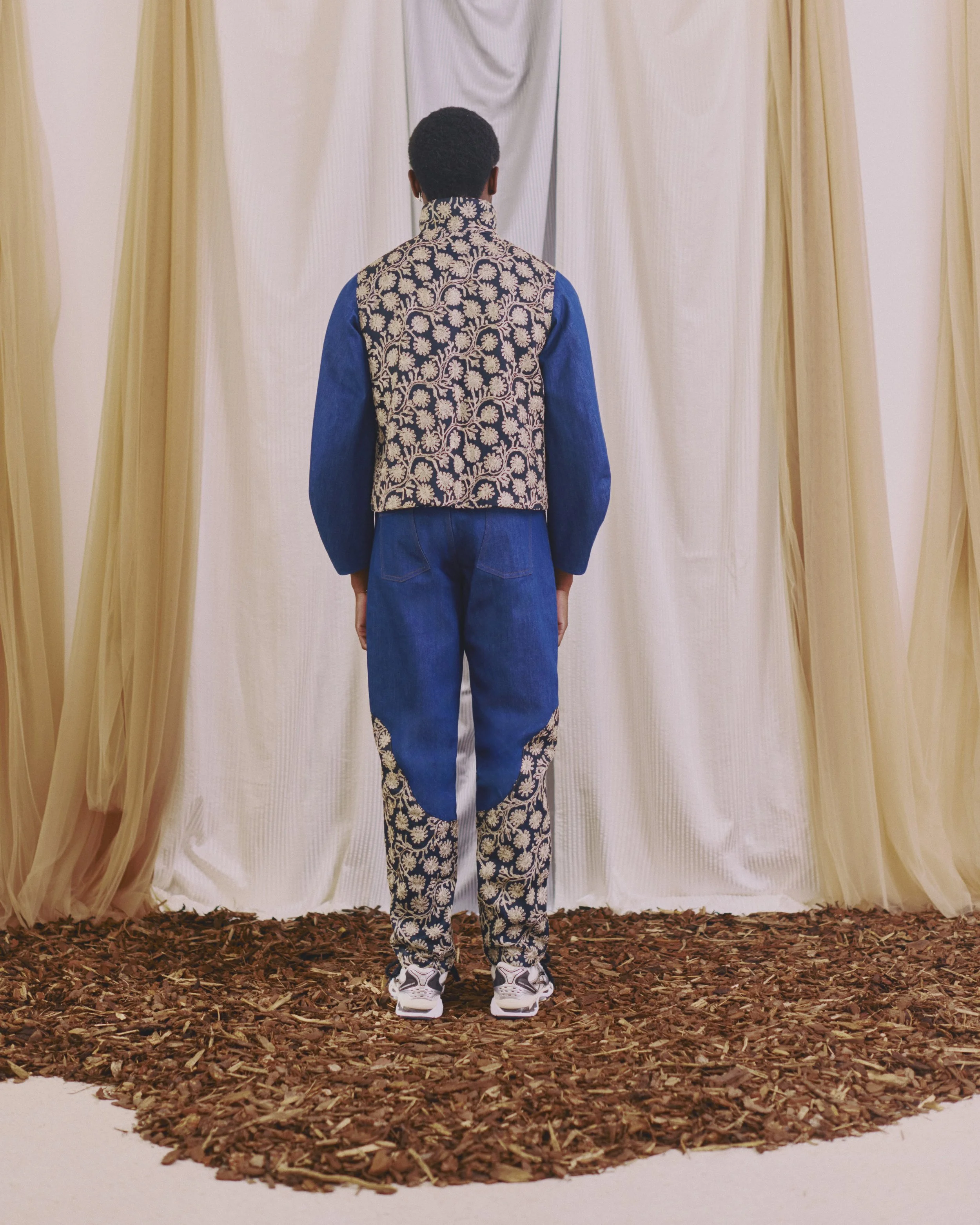 Tailored wide-leg pants crafted from luxurious Damascus silk cotton blend. These pants offer a sophisticated take on casual wear, combining the comfort of a relaxed fit with the elegance of Damascus silk cotton. On each side of the pants, a handcrocheted cotton band adorns the silk cotton, adding traditional craft to the silhouette. The elastic waistband offers adaptable comfort, while the luxurious fabric elevates the overall look. The fabric's unique properties allow for a polished appearance while maintaining a sense of ease, making these pants ideal for various settings from upscale casual events to creative workplaces.